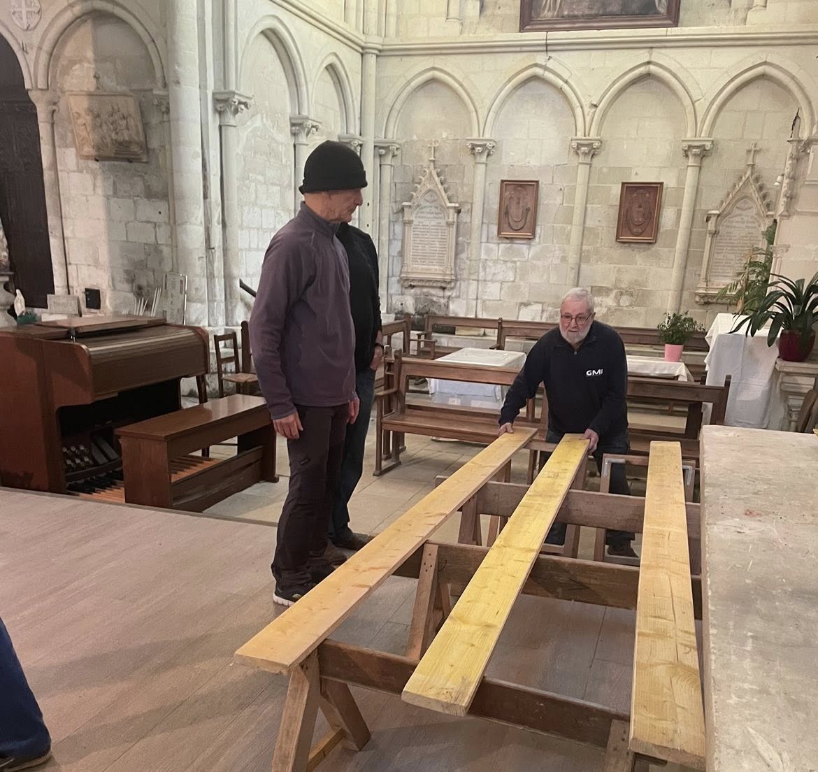 Je me suis donc déplacé à la Collégiale et j'ai effectivement trouvé deux plaques sculptées, sur le côté de l'autel, à gauche dans le choeur.